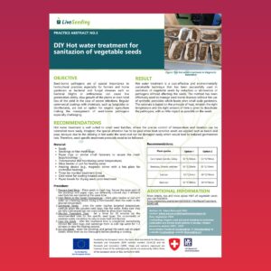Practice abstract with DIY hot water treatment protocols for sanitizing vegetable seeds: materials, step-by-step procedure, species-specific temps/times, caution for heat-sensitive seeds, and project contact/link.